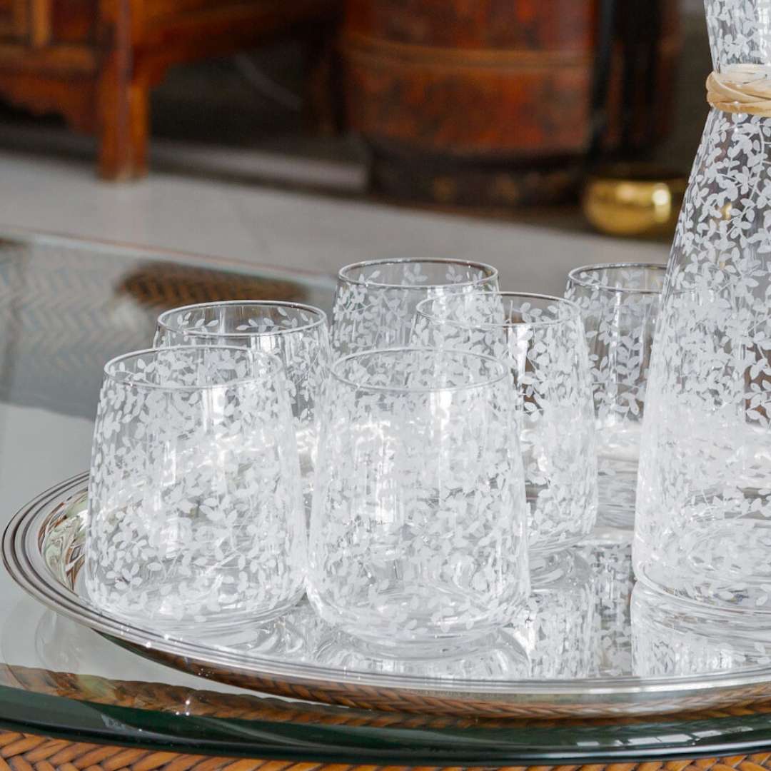 Crafted from clear glass and etched with elegant detailing, this engraved drinking glass brings a touch of refinement to everyday moments.