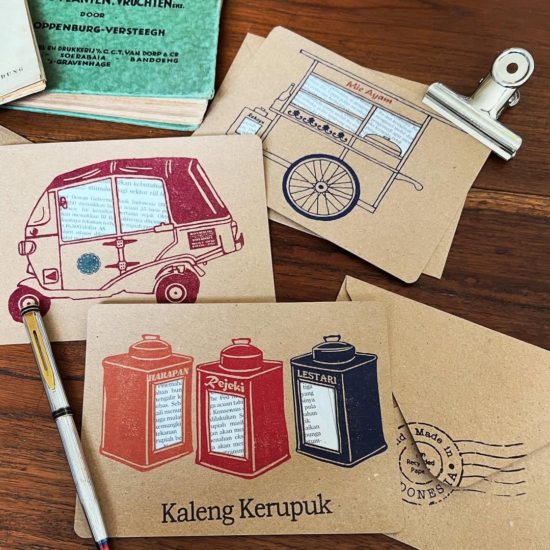 Handmade postcard with cut-out details and hand-printed images that features iconic Indonesian items. Postcard and envelope are made of recycled paper.