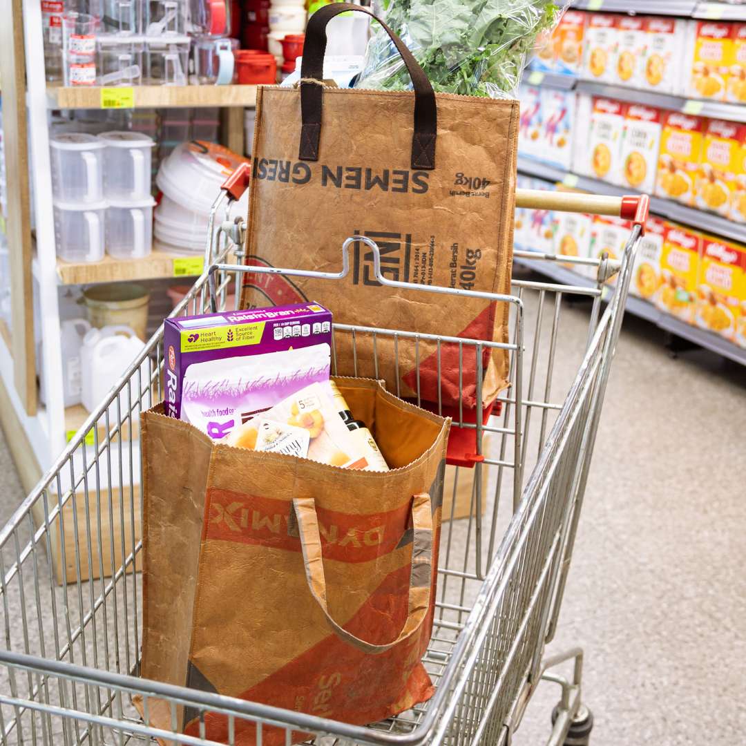 This recycled cement bag is made from repurposed cement packaging and reinforced with natural tree sap. It’s lightweight yet sturdy, suitable for daily use and built with sustainability in mind.